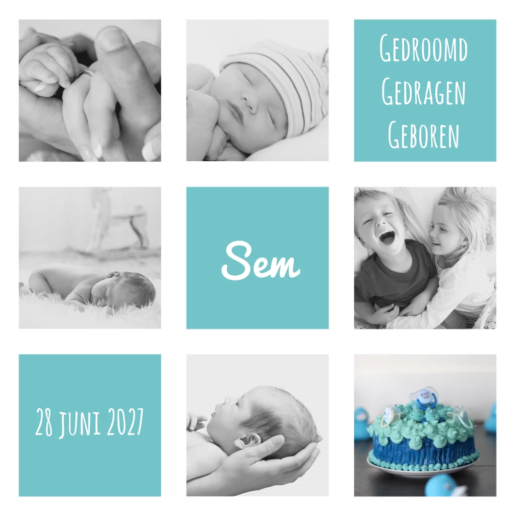 Geboortekaartje jongen turquoise vlakken en fotocollage. Voeg je eigen foto's toe en maak je kaartje helemaal persoonlijk! (1668)