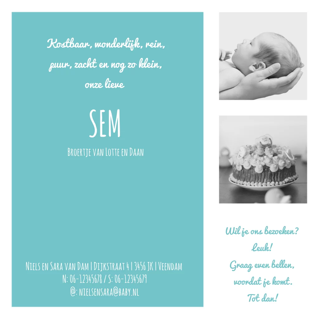 Geboortekaartje jongen turquoise vlakken en fotocollage