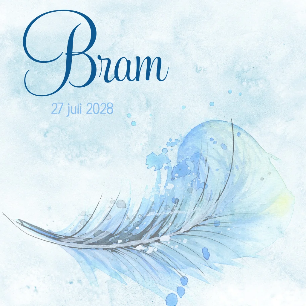 Geboortekaartje voor een jongen met waterverf en een geschilderde veer. (4064)