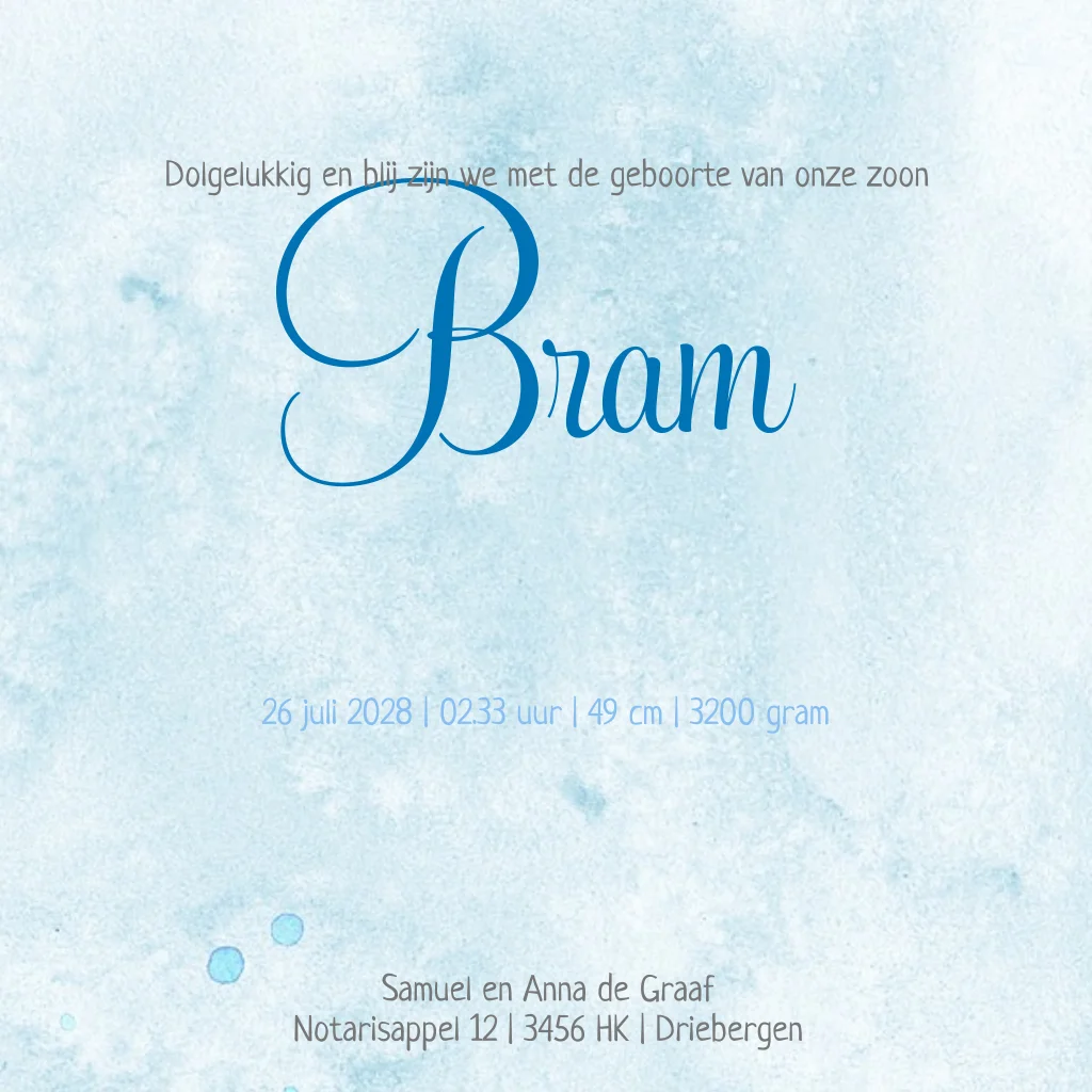Geboortekaartje voor een jongen met waterverf en veer