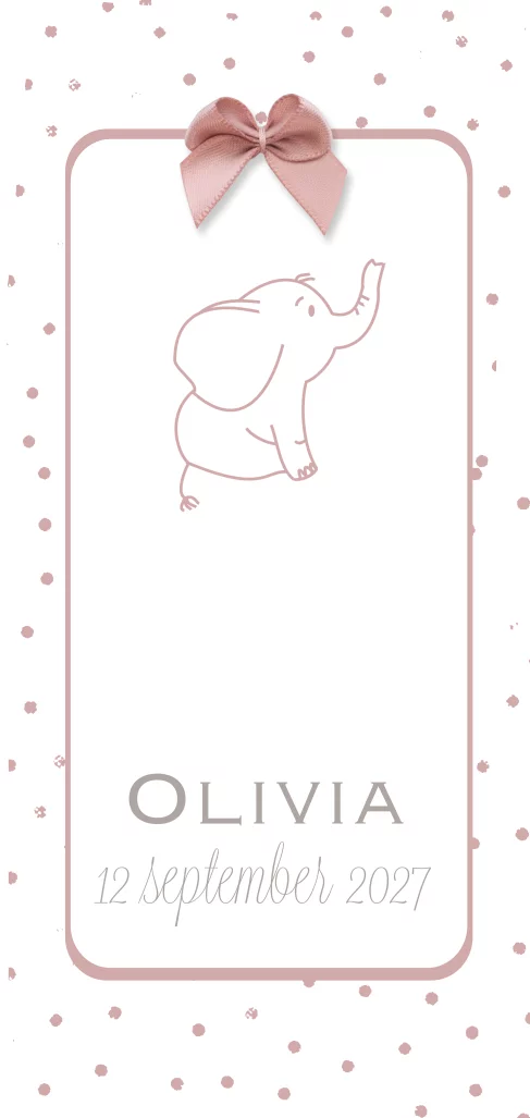 Geboortekaartje meisje met olifantje en echt strikje. LET OP: Het strikje op dit kaartje wordt niet afgedrukt, deze is ter voorbeeld. Bij de proefdruk of eindbestelling wordt niet standaard een strikje geleverd. Op die plek kun je straks zelf het échte strikje plakken die je in het bestelproces kunt bijbestellen. (7912)
