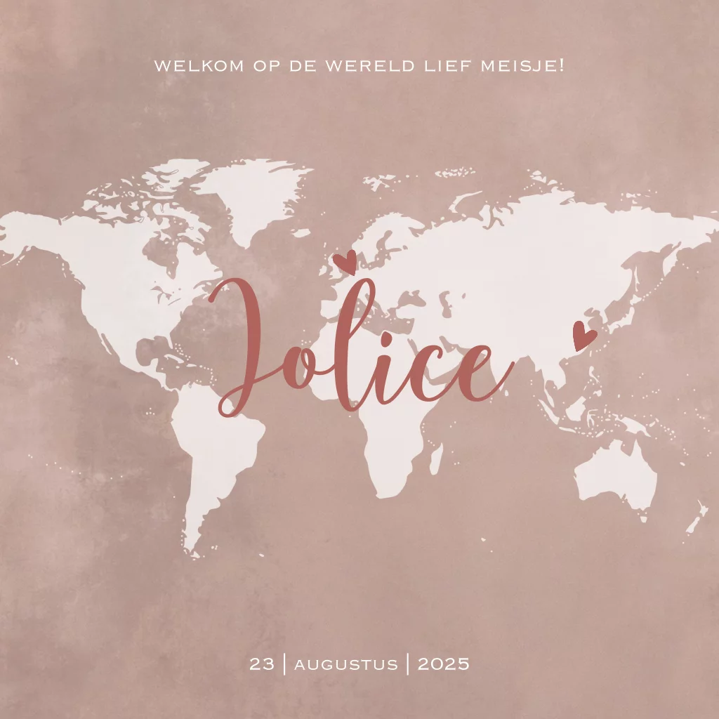 Geboortekaartje meisje met kaart van de wereld op oud roze achtergrondkleur. Voor een kindje wat de wereld mag gaan ontdekken. Extra leuk, plaats de hartjes op de kaart waar de ouders zijn geboren. Kan ook gebruikt worden als een kaart voor adoptie / adoptiekaartje. Plaats het hartje op de geboorteplaats op de wereld. (22816)