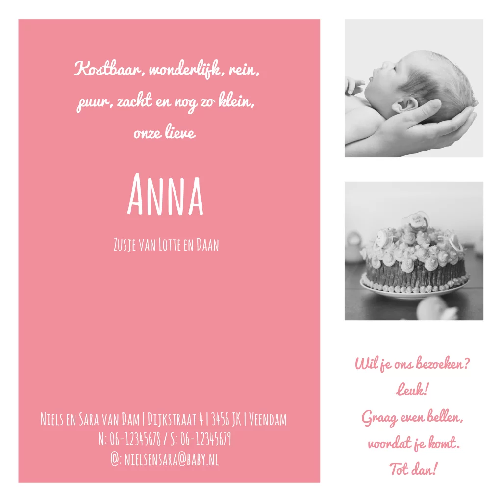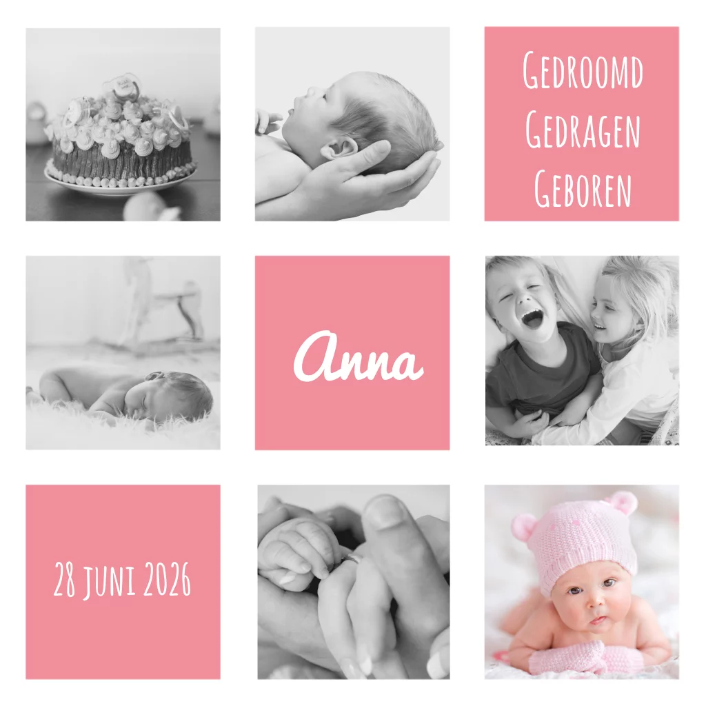 Geboortekaartje meisje met roze vlakken en fotocollage. Heb je hulp nodig bij het plaatsen van de foto's, vraag ons gerust! (1669)