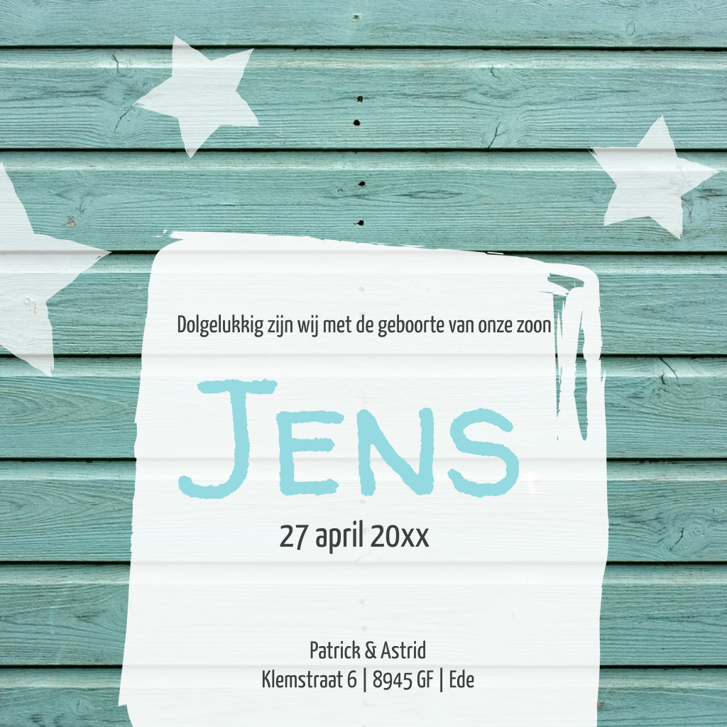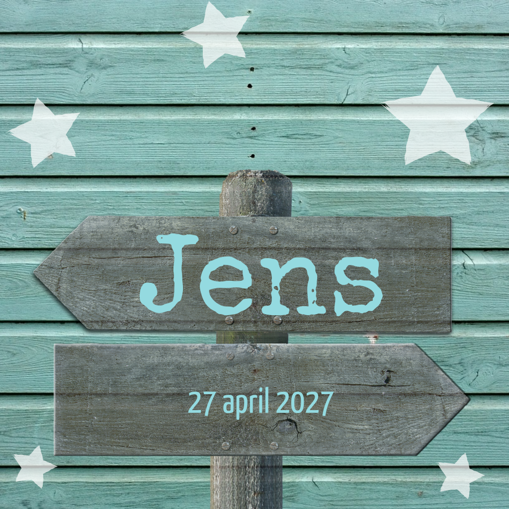 Hip geboortekaartje voor een jongen met blauw steigerhout, houten bord en sterren. (3502)