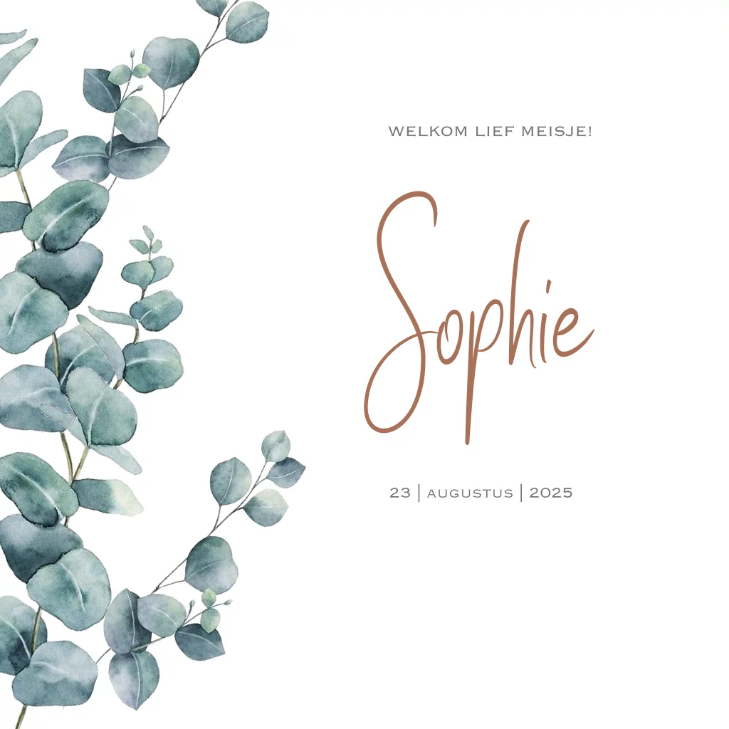 Geboortekaartje met geschilderde eucalyptus takken in een warme grijs groene kleur. (999999) Geboortekaartje Sophie