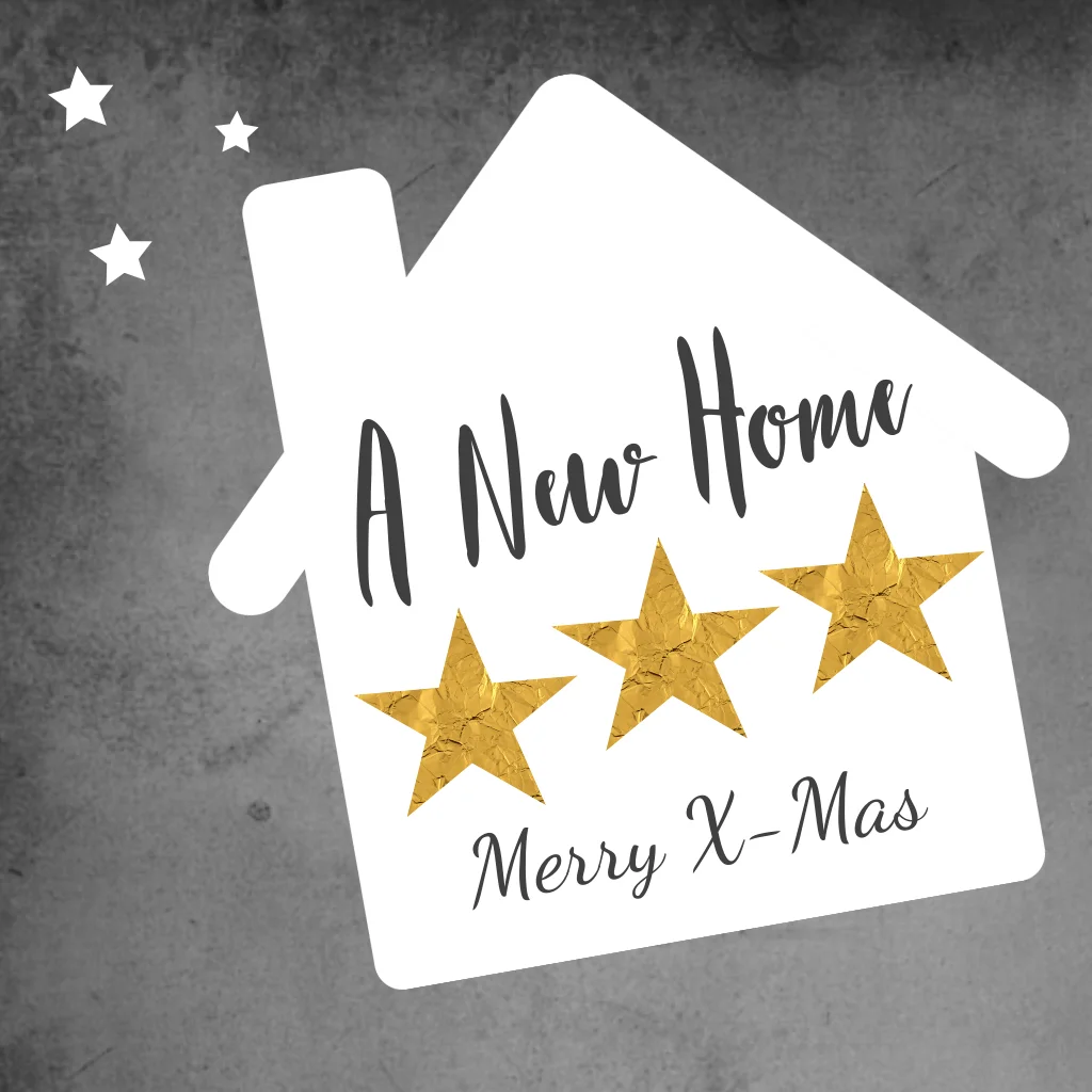 Hippe kerst verhuiskaart met huis en goudkleurige sterren en krijtbord. (5891)