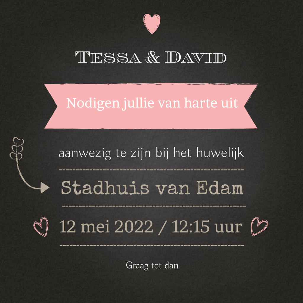 Hippe trouwkaart papa en mama gaan trouwen krijtbord met roze getekend hart en typografie. (2399)