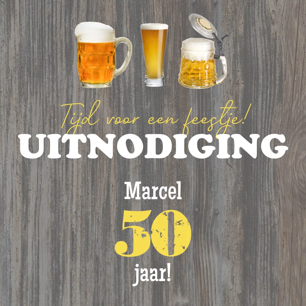 Stoere hout look uitnodigingskaart voor een feestje man 50 jaar bier en bierglazen. (22348)