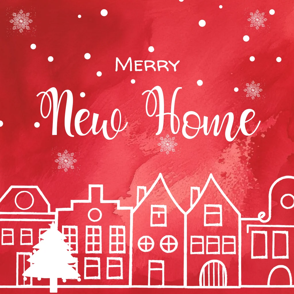 Kerst verhuiskaart met huisjes, kerstboom, rode waterverf achtergrond en de tekst: Merry New Home. (2198)
