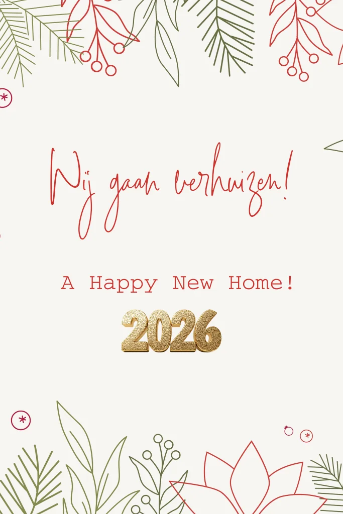 Kerst verhuiskaart met takjes groen en rood. (22644)