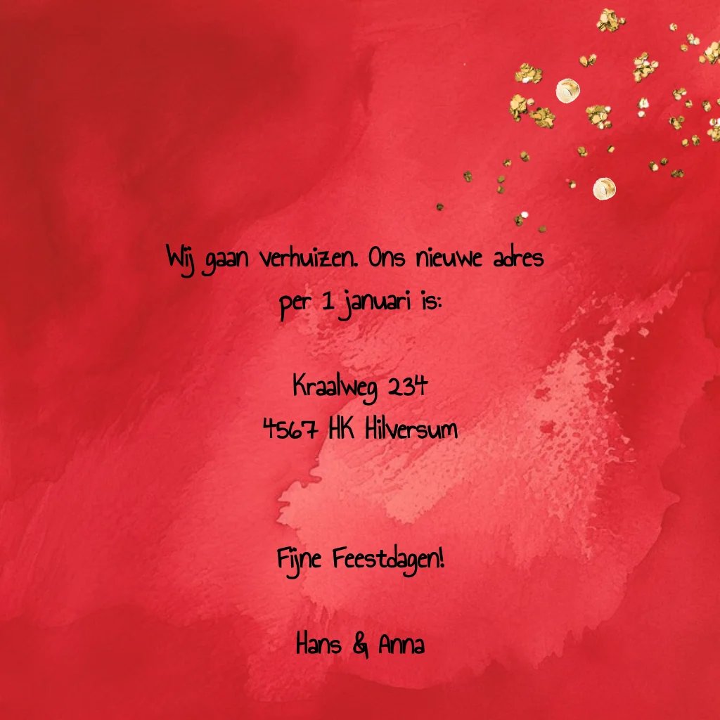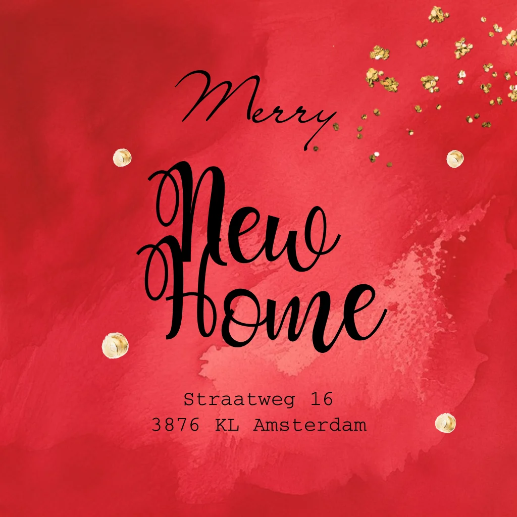 Kerst verhuiskaart warm rood met goud look snippers en tekst: Merry new home. (99999)