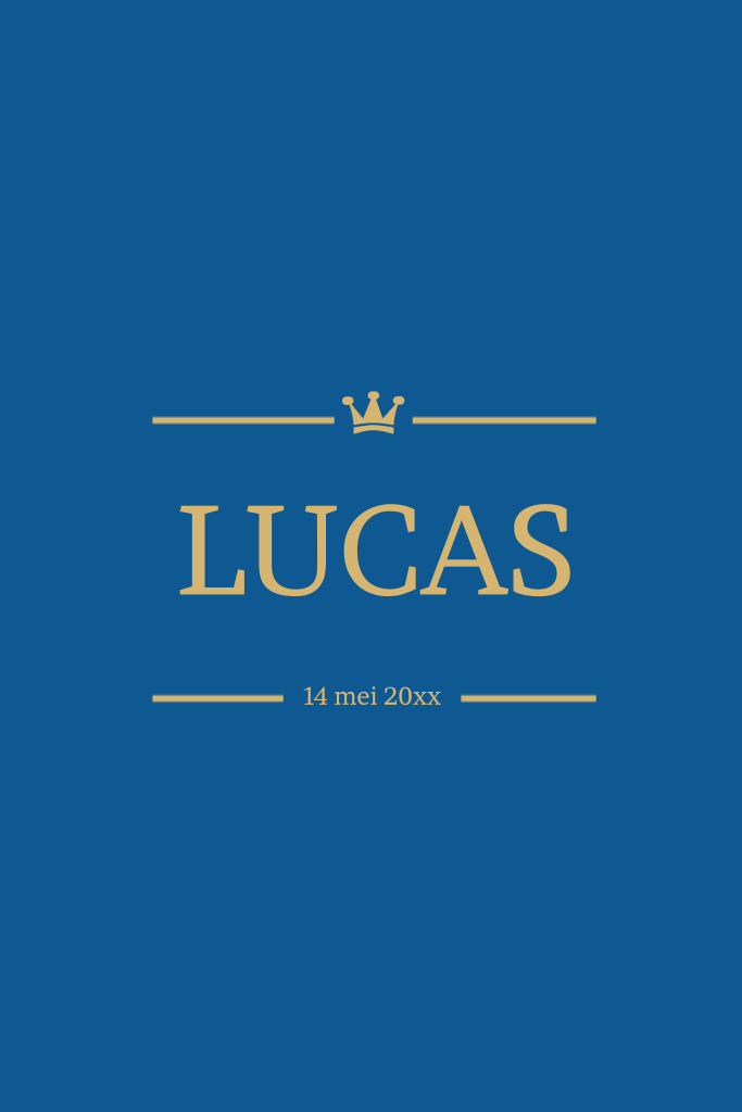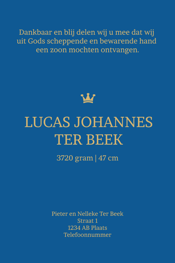 Klassiek en christelijk jongens geboortekaartje in het donkerblauw met een kroontje in het goudkleur (4051).