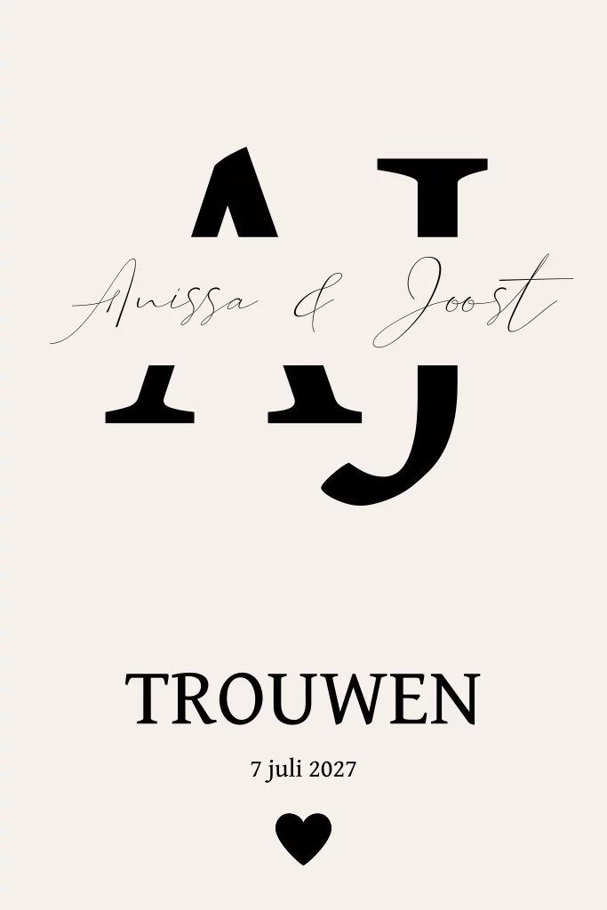 Klassieke enkele trouwkaart met voorletters / initialen groot op de voorkant en daarin de namen geschreven. De kleuren en lettertypes zijn naar wens aan te passen. (24452)
