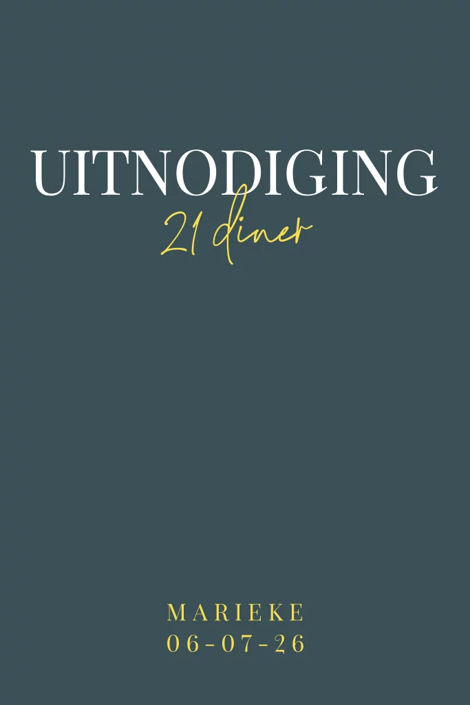 Klassieke uitnodiging 21 diner. Klassiek font met modern handgeschreven font. De kleuren zijn allemaal naar wens aan te passen. Tevens bijpassende menukaart leverbaar. (22959)