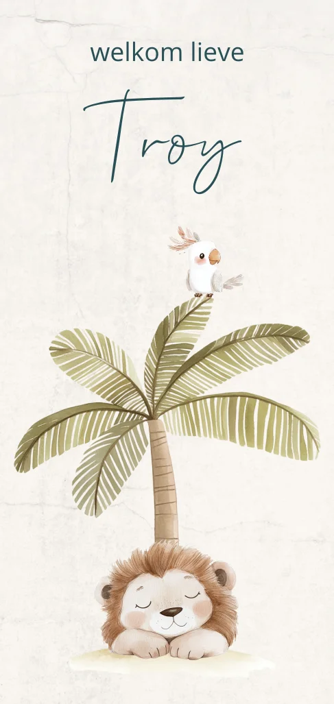Geboortekaartje met leeuw / welp die heerlijk ligt te slapen onder een palmboom met een papegaai in de palm. Kleuren en lettertypes zijn naar wens aan te passen. (30177)