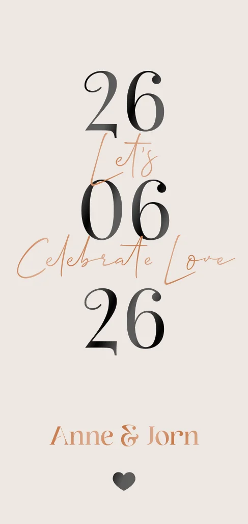 Mooie uitnodiging voor een bruiloft. Deze trouwkaart heeft een stijlvol design met op de voorkant naar wens kleurbare cijfers in hoogglans glimmende spot uv lak. Pas kleuren en lettertypes naar wens aan. (24468)