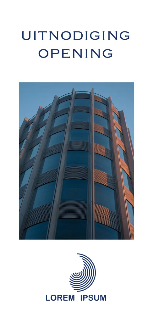 Langwerpige uitnodigingskaart voor een opening van een bedrijf of kantoorpand. Vervang eenvoudig de foto door een eigen variant, pas het aan in de bedrijfskleuren en plaats een logo. Hulp nodig bij het plaatsen van de foto? Neem contact op (6631)