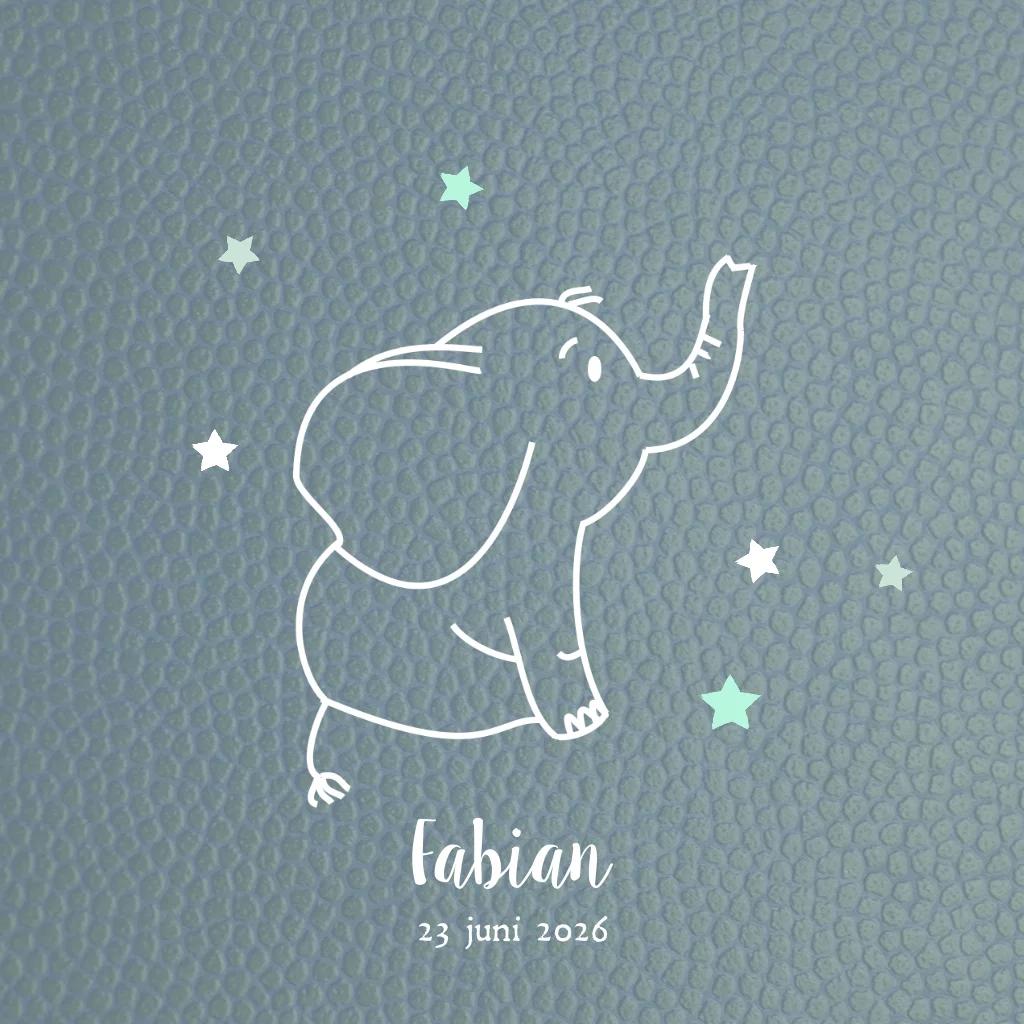 Lief geboortekaartje olifant voor een jongen met een lijntekening van een olifant. Op de achtergrond een olifanten huid leder look print. (7366)