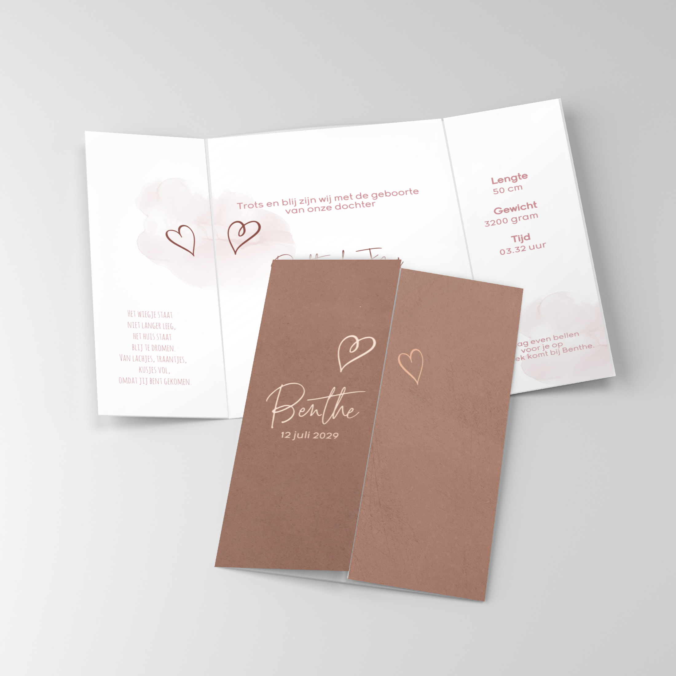Geboortekaartje voor een meisje in trendy kleur, met foliedruk, hartjes en theatervouw.