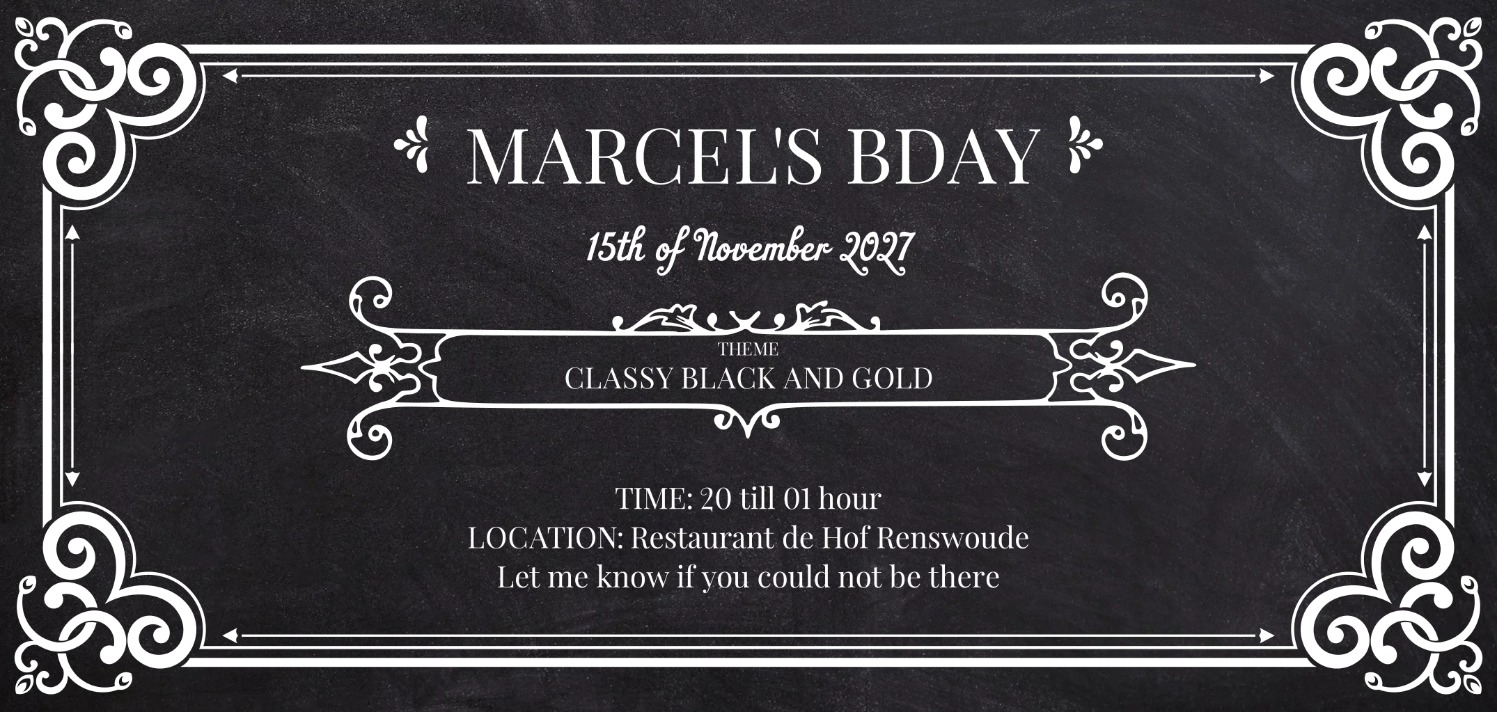 Op de voorkant geeft de zwarte achtergrond (krijtbord look) met daarop de glimmende goudfolie art deco versieringen een luxe en tevens classy uitstraling. Wil je ook folie op de achterkant (€0,80 extra) neem even contact met ons op.