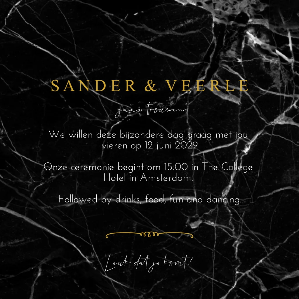 Hippe en moderne trouwkaart met zwart marmer look achtergrond en goudfolie letters. (999999)