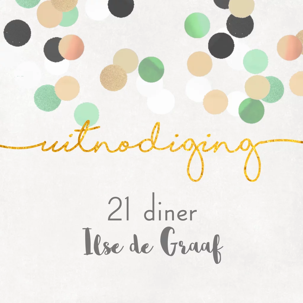 Moderne uitnodiging voor een 21 diner. Trendy design met confetti in pastelkleuren en goud gekleurde letters. (4503)