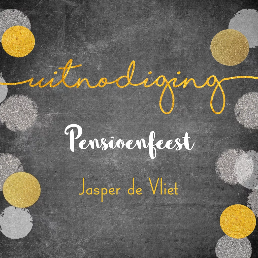 Moderne uitnodiging voor een pensioen feest. Trendy design met confetti in zilver, goudkleur en grijs en goud gekleurde letters. (4389)
