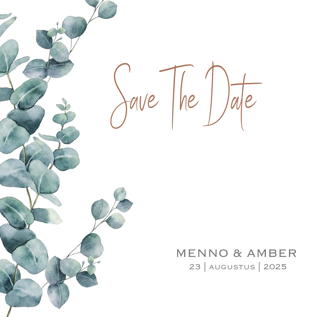 Mooie save the date kaart met geschilderde eucalyptus takjes