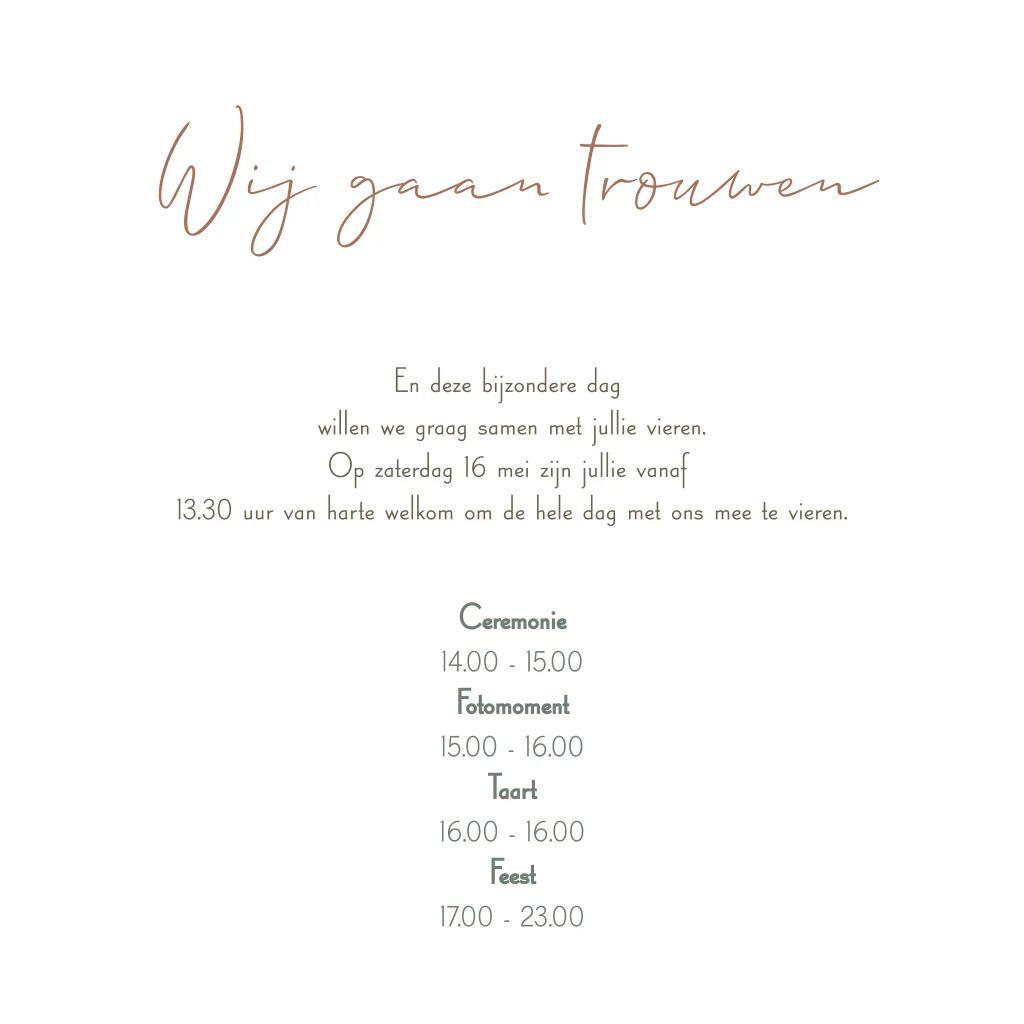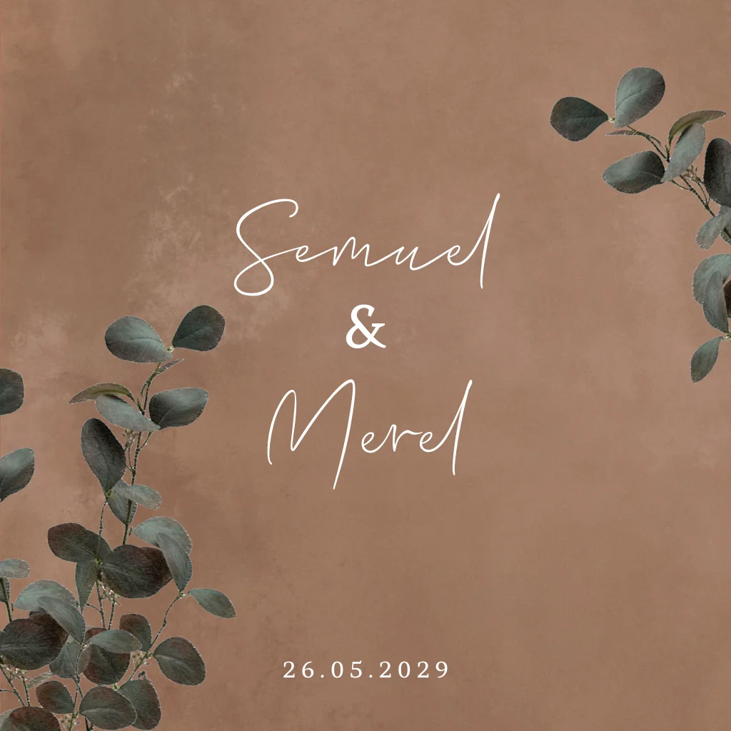Mooie warme trouwkaart met warm rode kleur en eucalyptus. De trouwkaart kan gedrukt kan worden in 11 of 13 cm hoogte. (23622)
