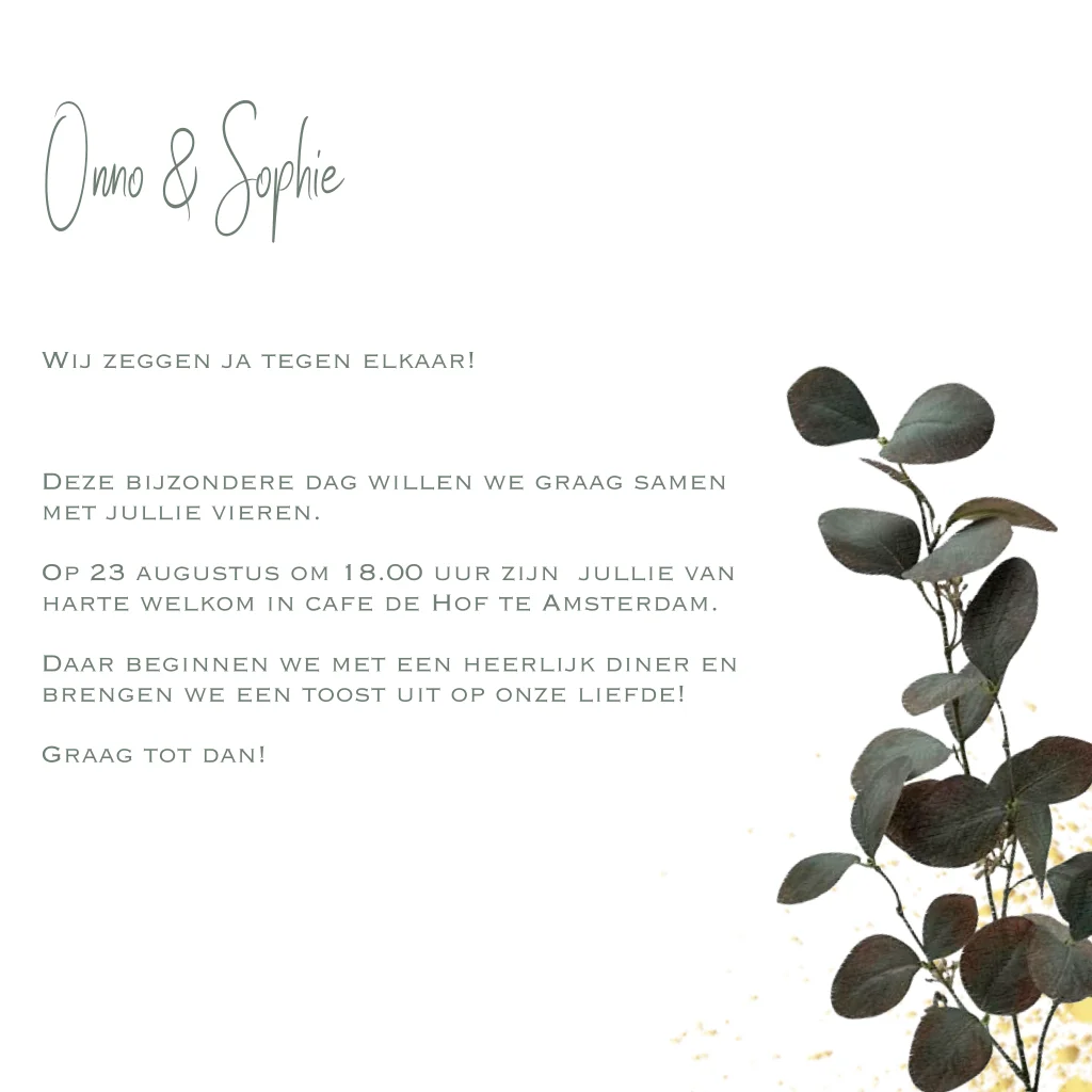 Prachtige trouwkaart met eucalyptus takken en goud look