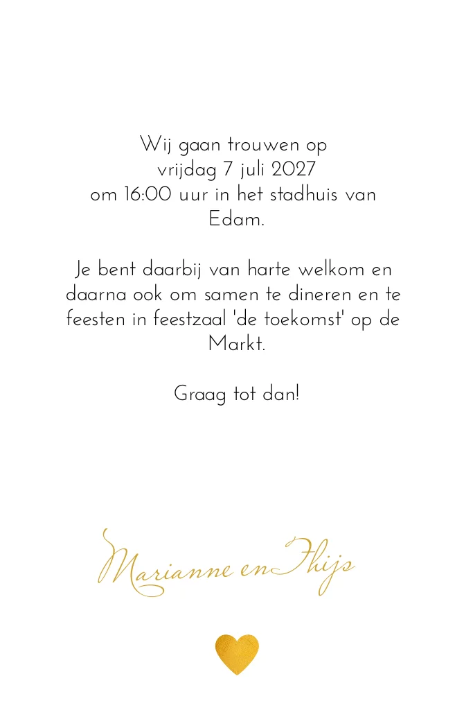 Staande trouwkaart met foto achter tekst. De lettertypes en kleur van de achtergrond kun je eenvoudig zelf aanpassen. Hulp nodig? Neem contact met ons op. (8050)
