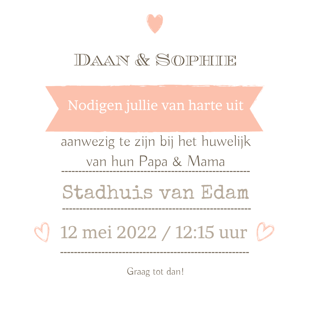 Trendy trouwkaart papa en mama gaan trouwen wit met roze getekend hart en typografie. (2400)