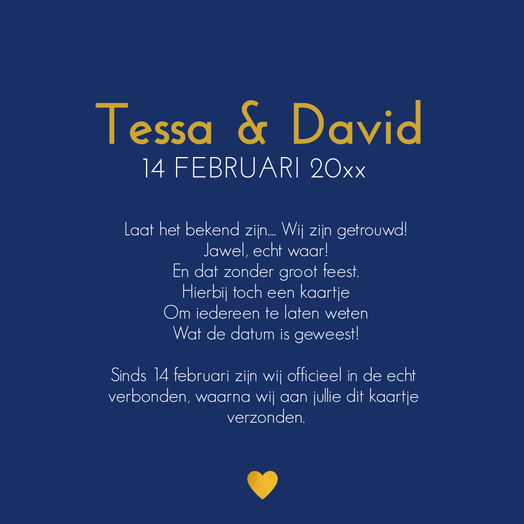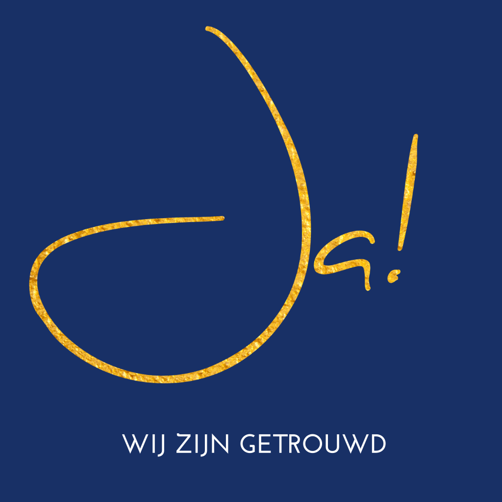 Trendy trouwkaart WIJ ZIJN GETROUWD donkerblauw met goud-look letters en typografie. De achtergrondkleur is naar wens aan te passen. (6394)