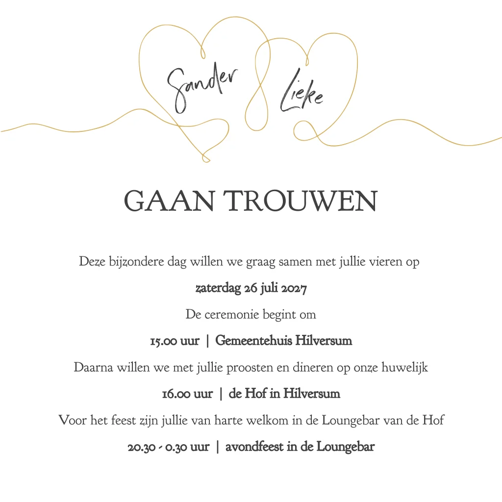 Clean moderne trouwkaart met 2 harten in elkaar verstrengeld in mooie gelijkende goudfolie foliedruk. De kleuren van de tekst en achtergrond en lettertypen zijn eenvoudig naar wens aan te passen.(23083) trouwkaart voorbeeld. Let op: het kan zijn dat de lijntjes goud niet helemaal tot de rand lopen, dit is helaas niet altijd doorlopend te krijgen met foliedruk.