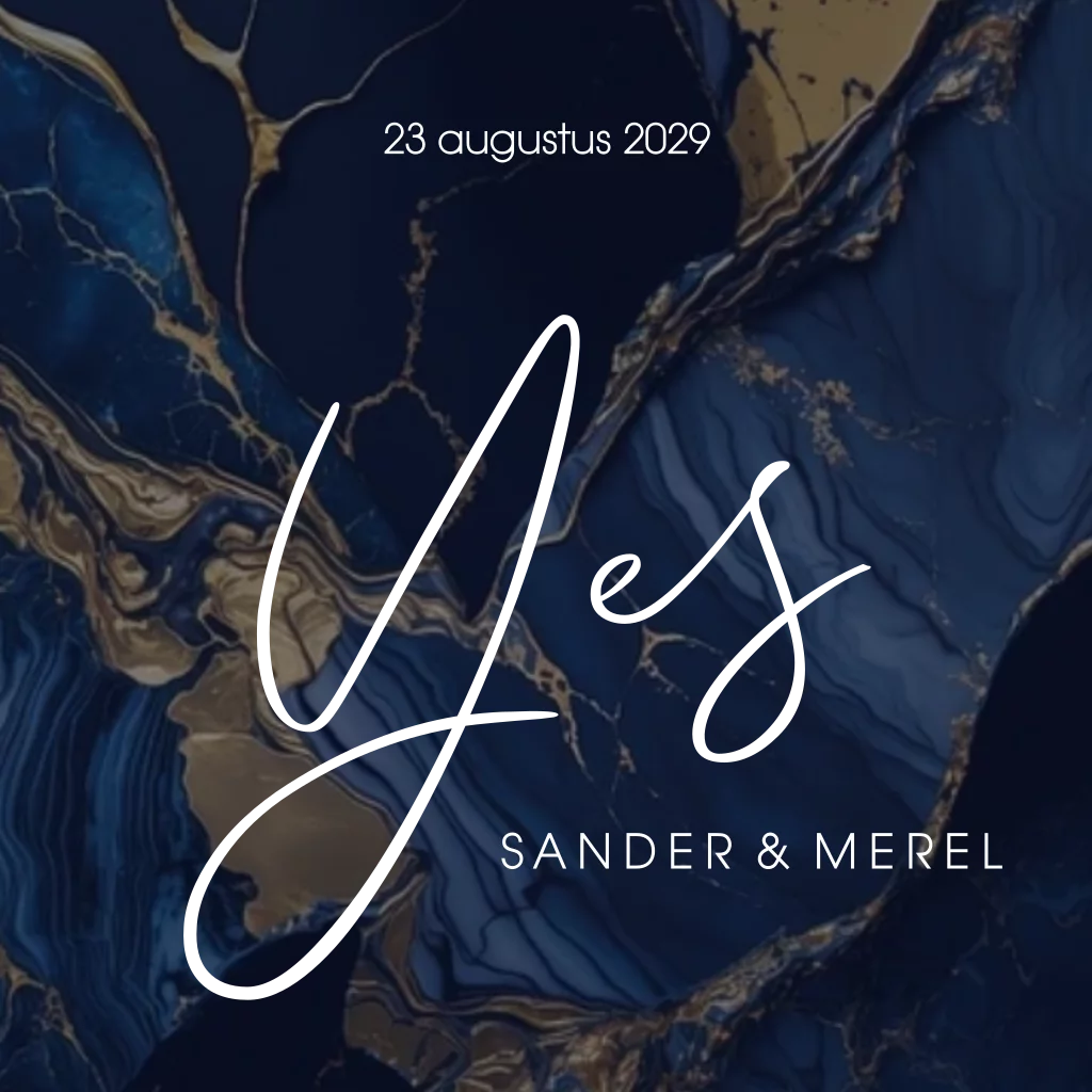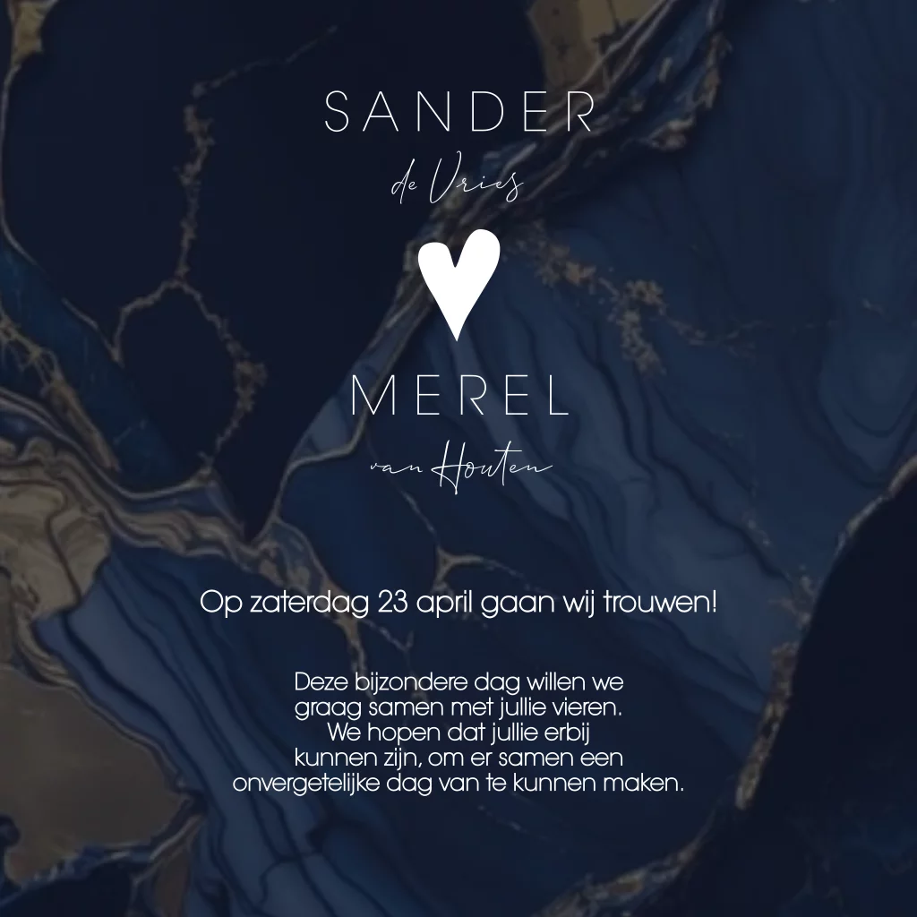Moderne marmer look trouwkaart. Donkerblauw met goud. (23697)