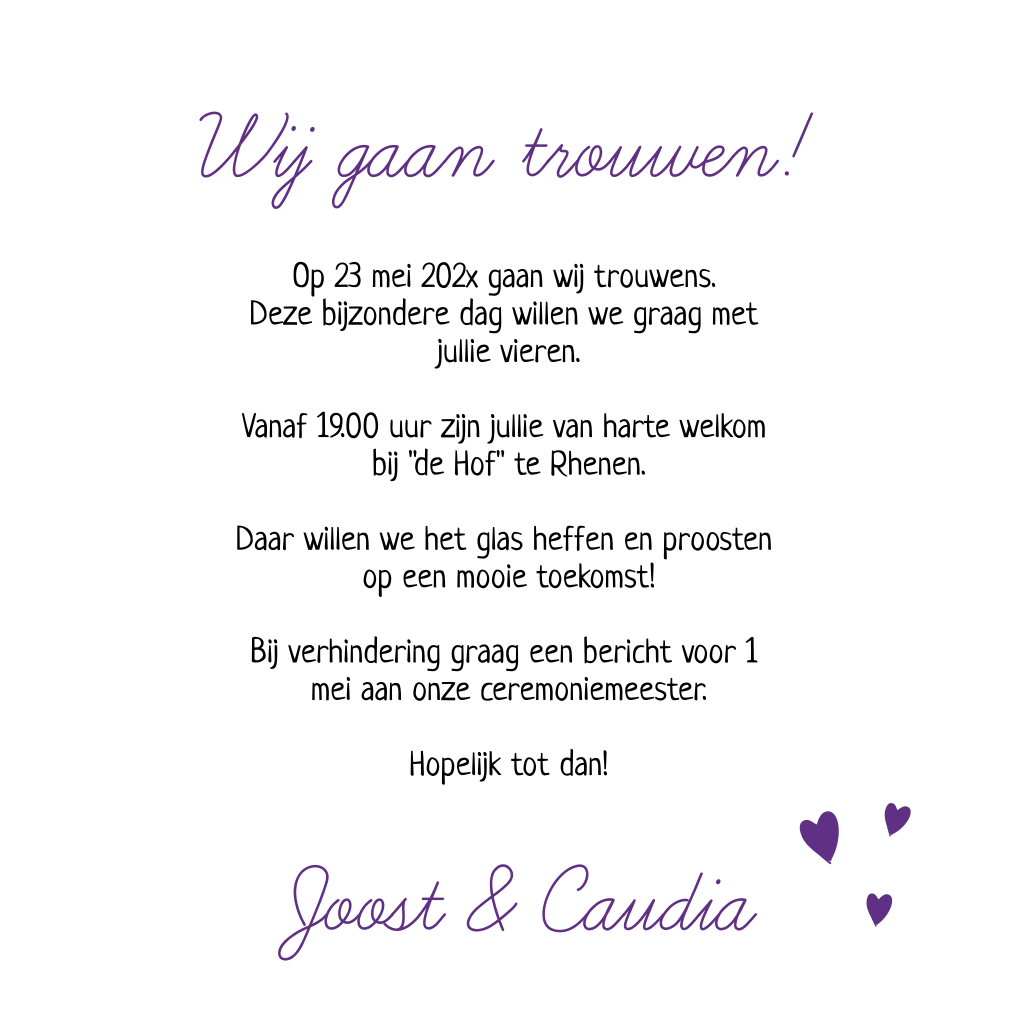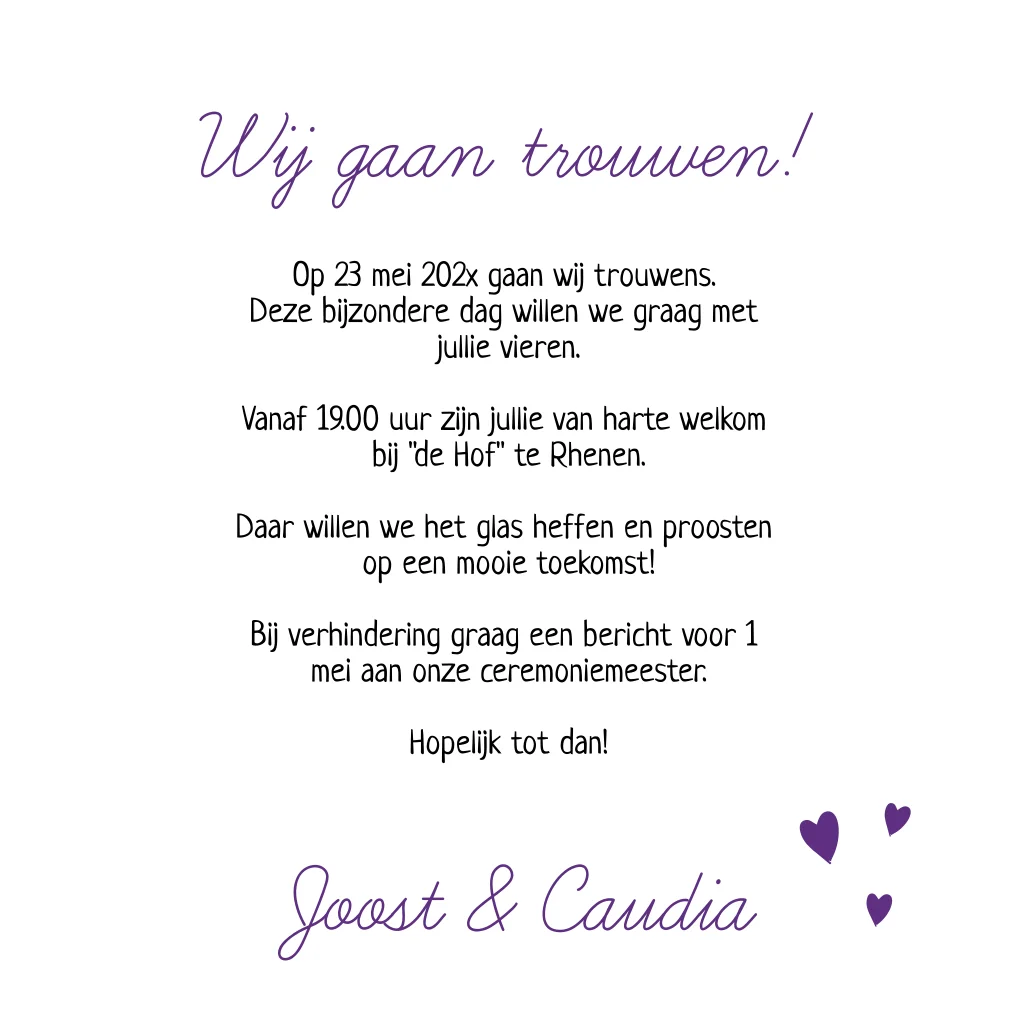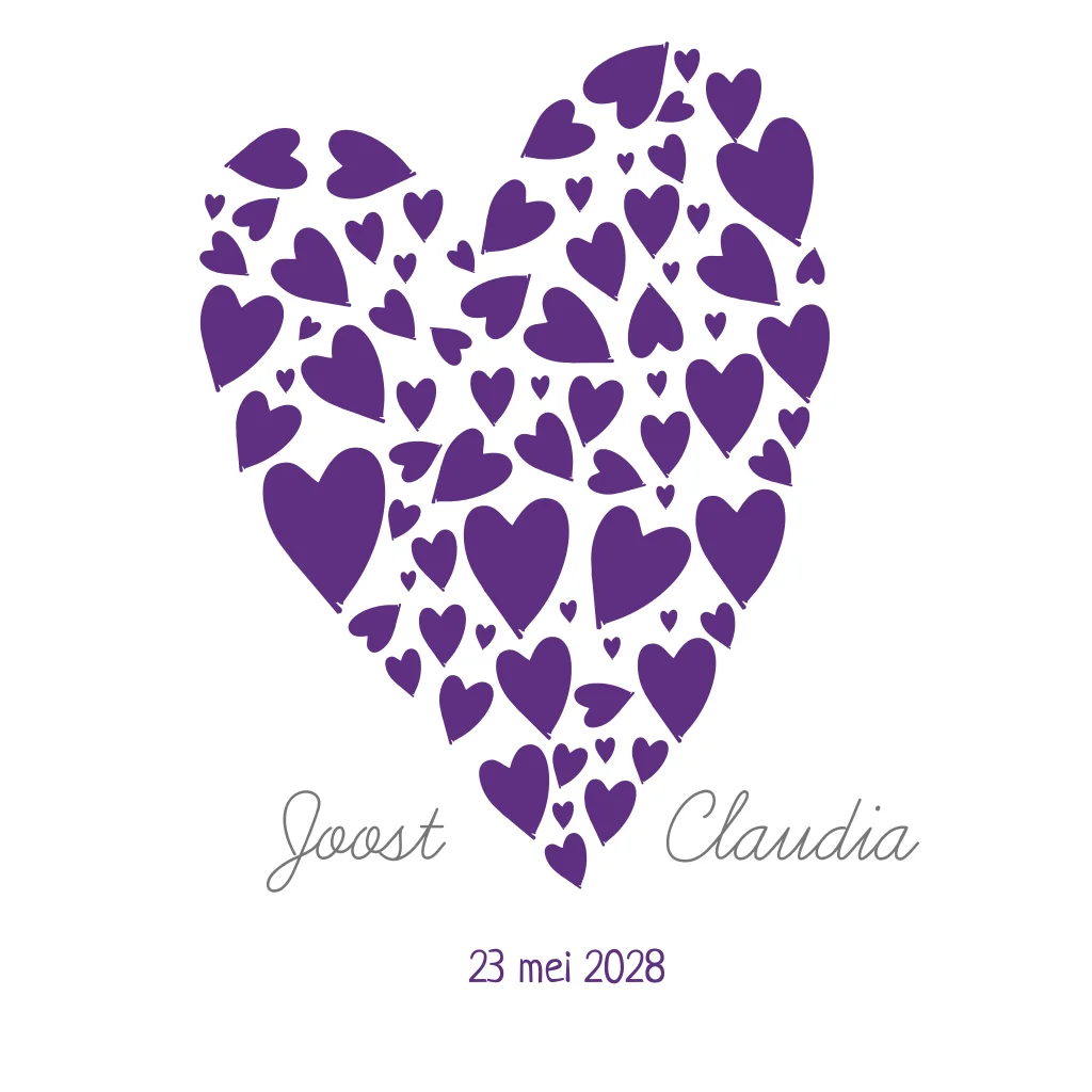 Mooie trouwkaart met een groot hart gemaakt van kleine hartjes paars en wit. (4161)
