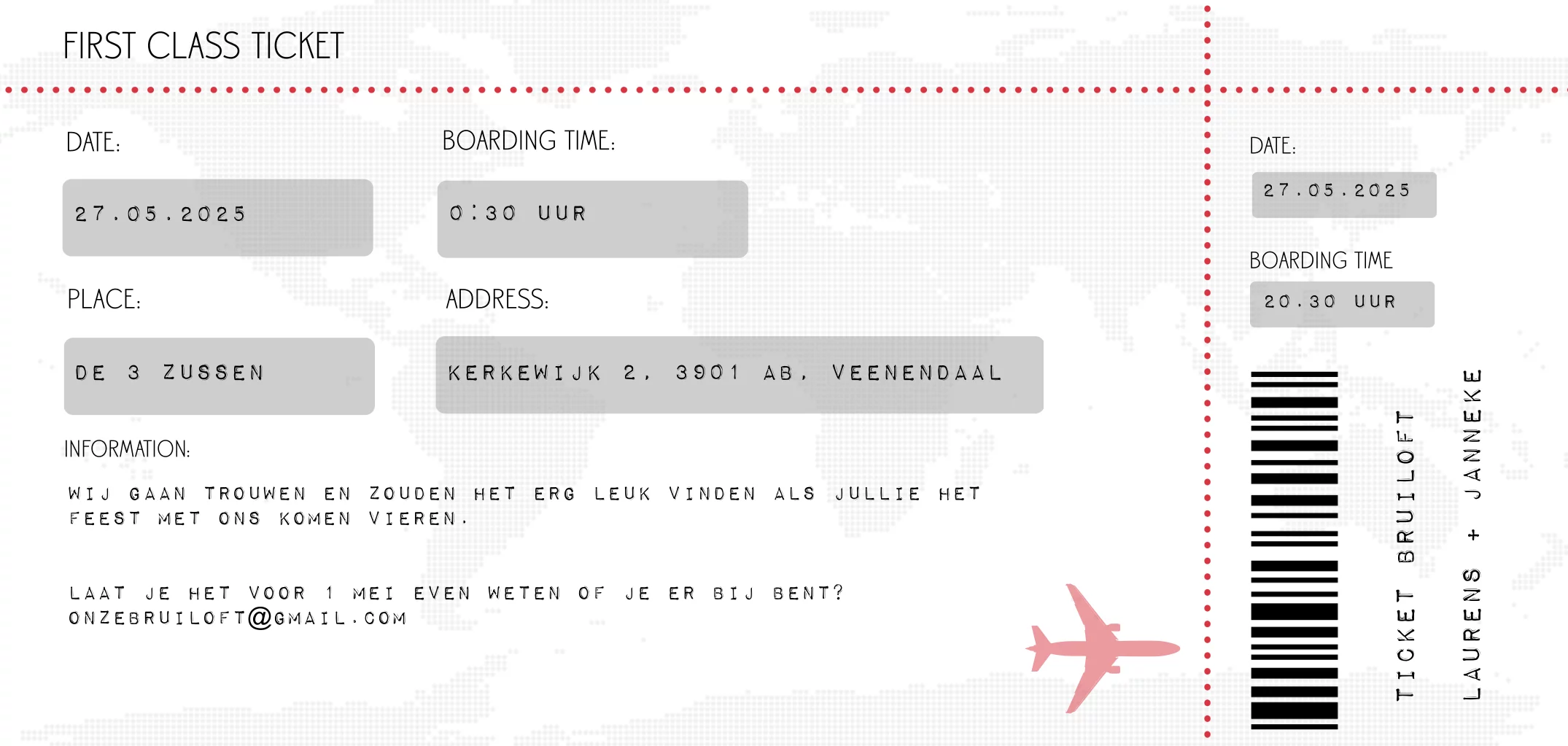 Vliegticket trouwkaart langwerpig formaat