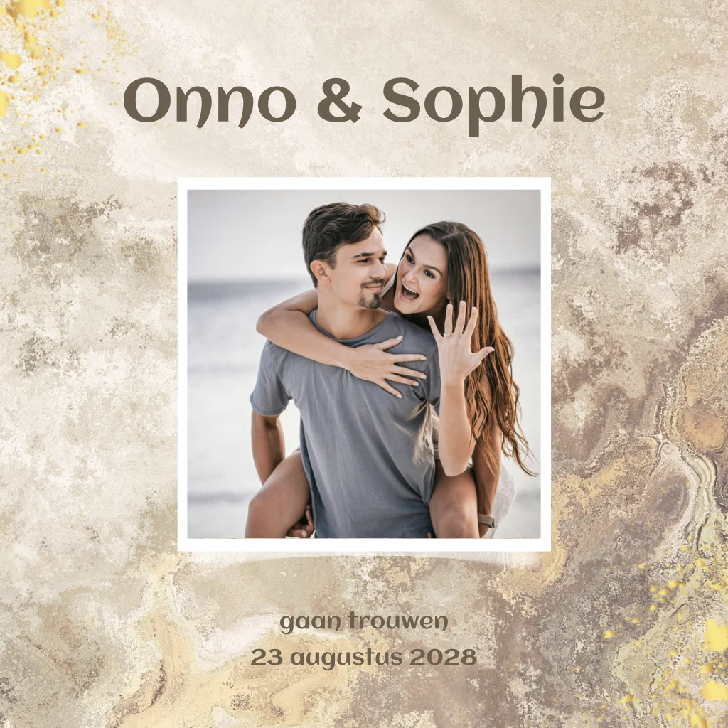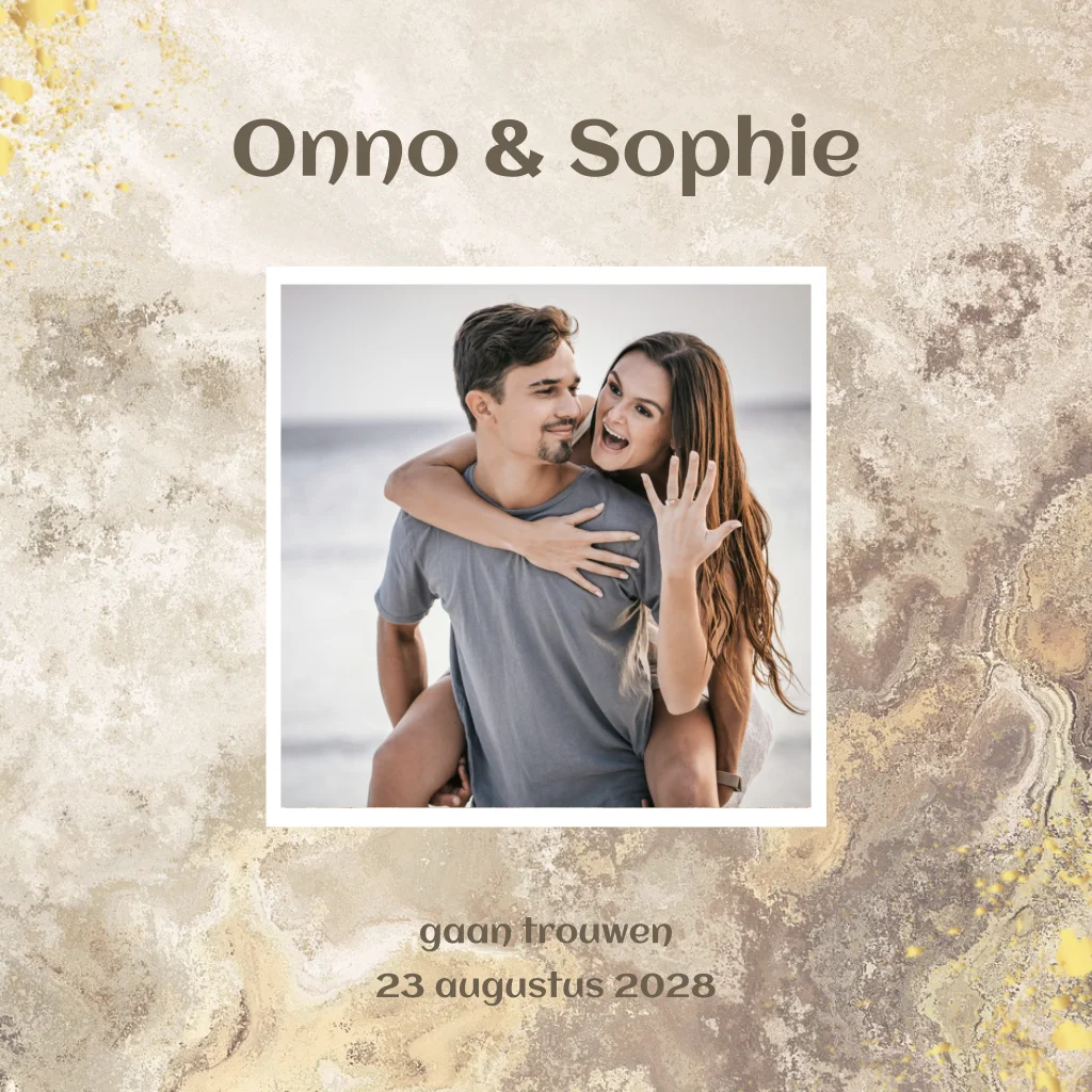Marmer trouwkaart met ruimte voor een eigen foto. Warme achtergrondkleur bruin, beige goud goudlook verf spetters. (22731)