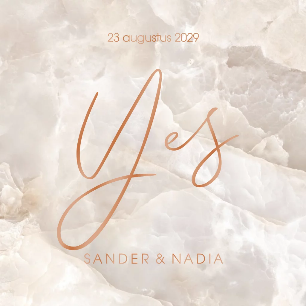Trouwkaart marmer achtergrond beige wit brons met hoogglans koperlook luxe glanzend effect op de voorkant. (23697)