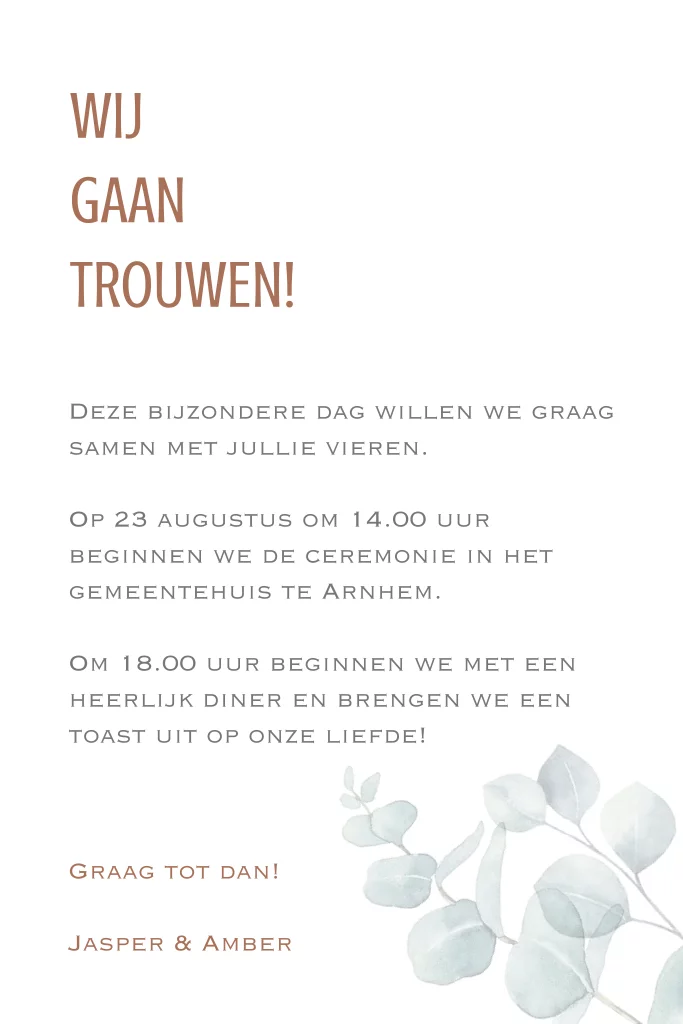 Trouwkaart met aquarel getekende eucalyptus takjes bladeren. (999999)
