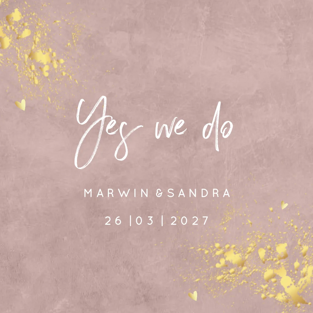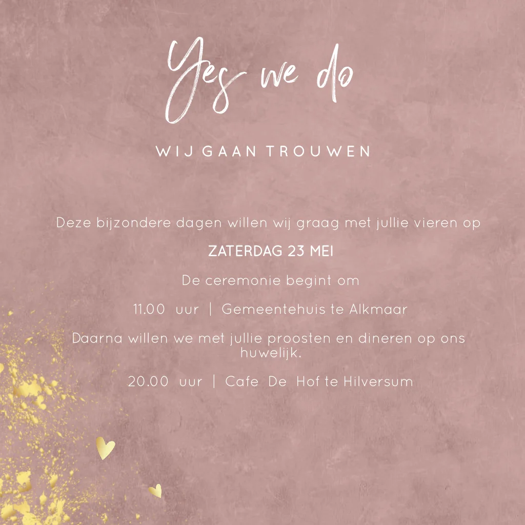 Trouwkaart oud roze achtergrond met goud look verf spetters en hartjes. Aan de binnenkant is er ruimte voor een eigen foto. (23085)