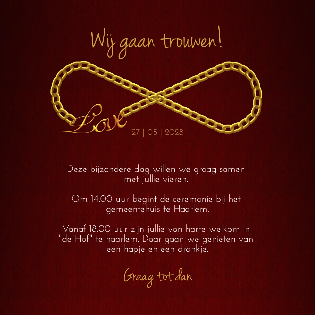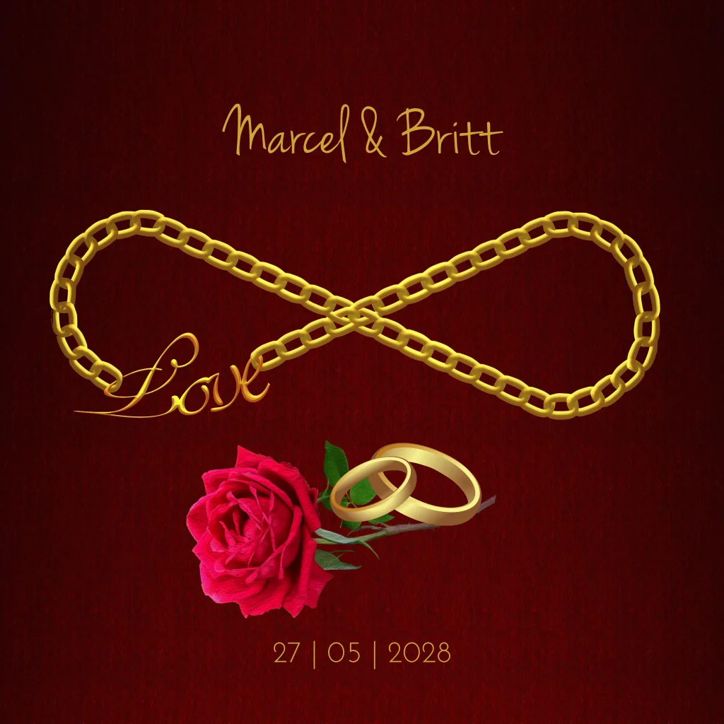 Trouwkaart met goudlook infinity teken met een donker rode achtergrond, een roos en goudlook ringen. (22977)
