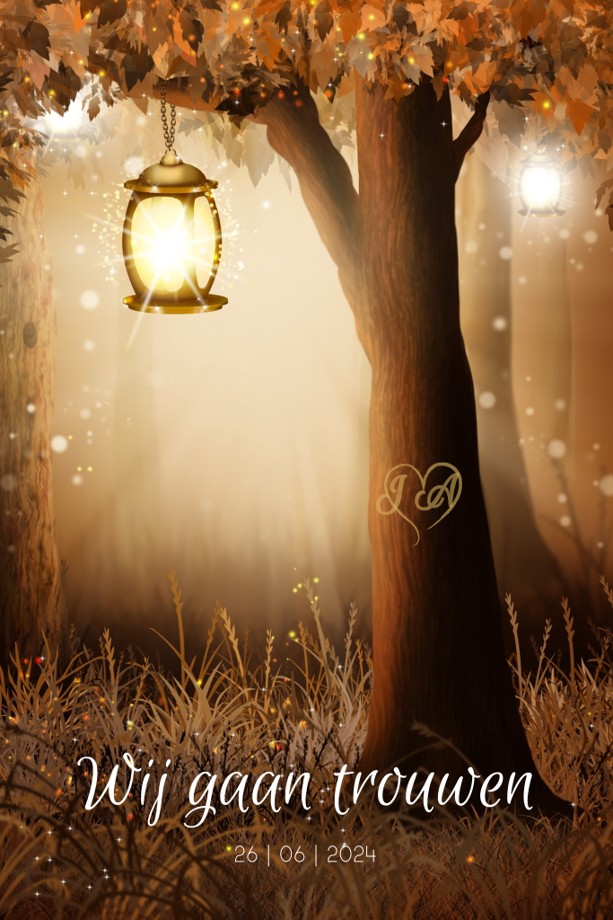 Trouwkaart sprookjes huwelijk bos boom en lantaarn