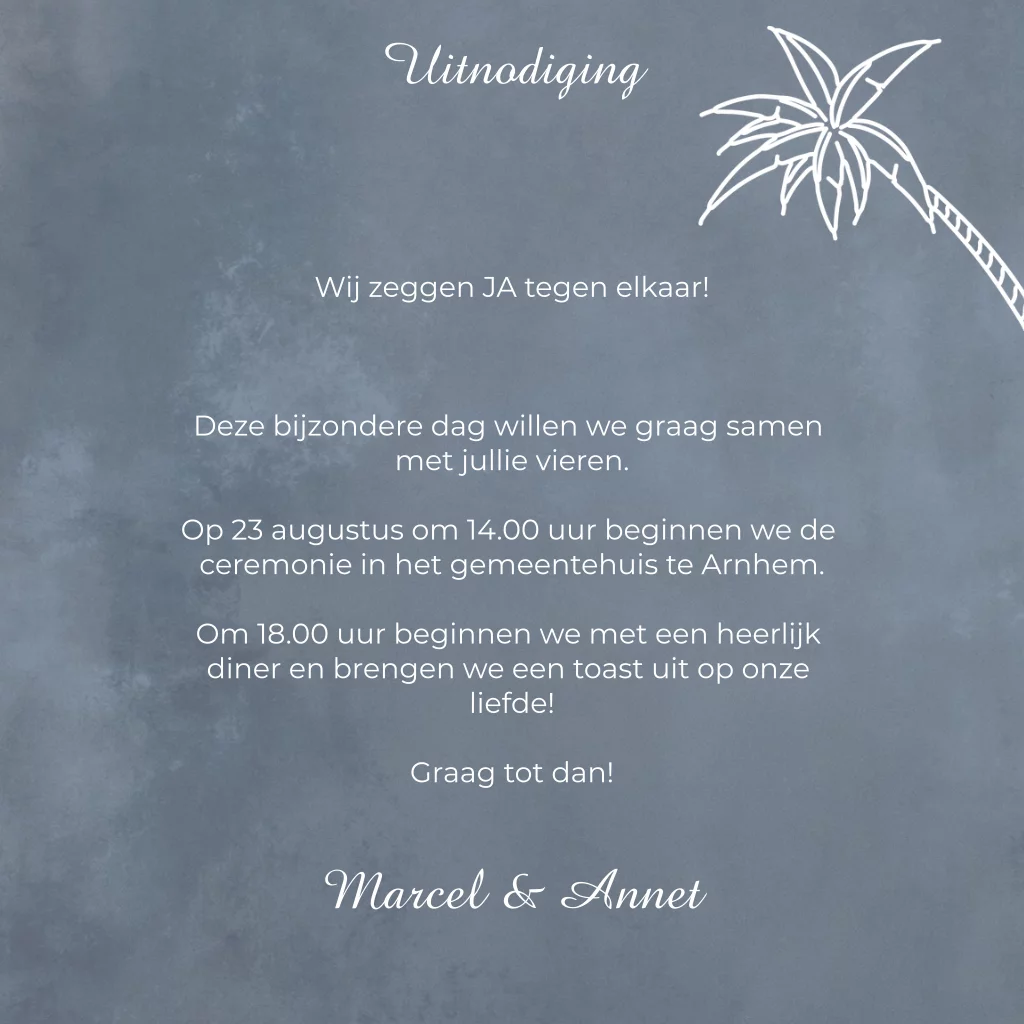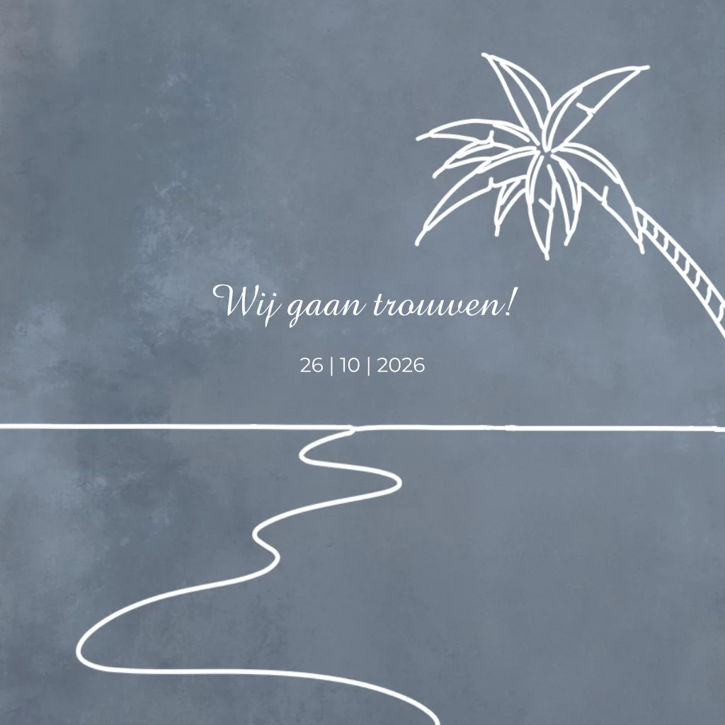 Moderne blauwe trouwkaart met strand thema en palmboom. Lijntekening. (22865)