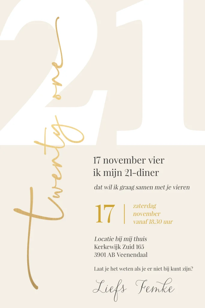 Chique uitnodiging 21-diner met mooie typografie 21-diner. Kleuren kunnen naar wens aangepast worden. (24189)