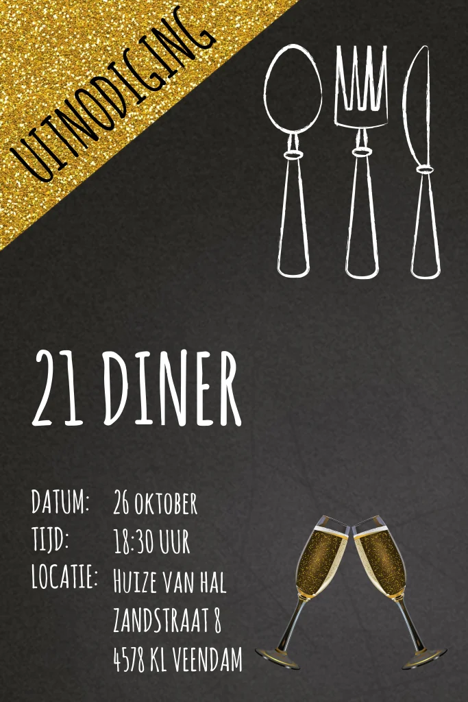 Uitnodiging 21 diner in de kleuren zwart-goud-look met mes vork en lepel. (2770)