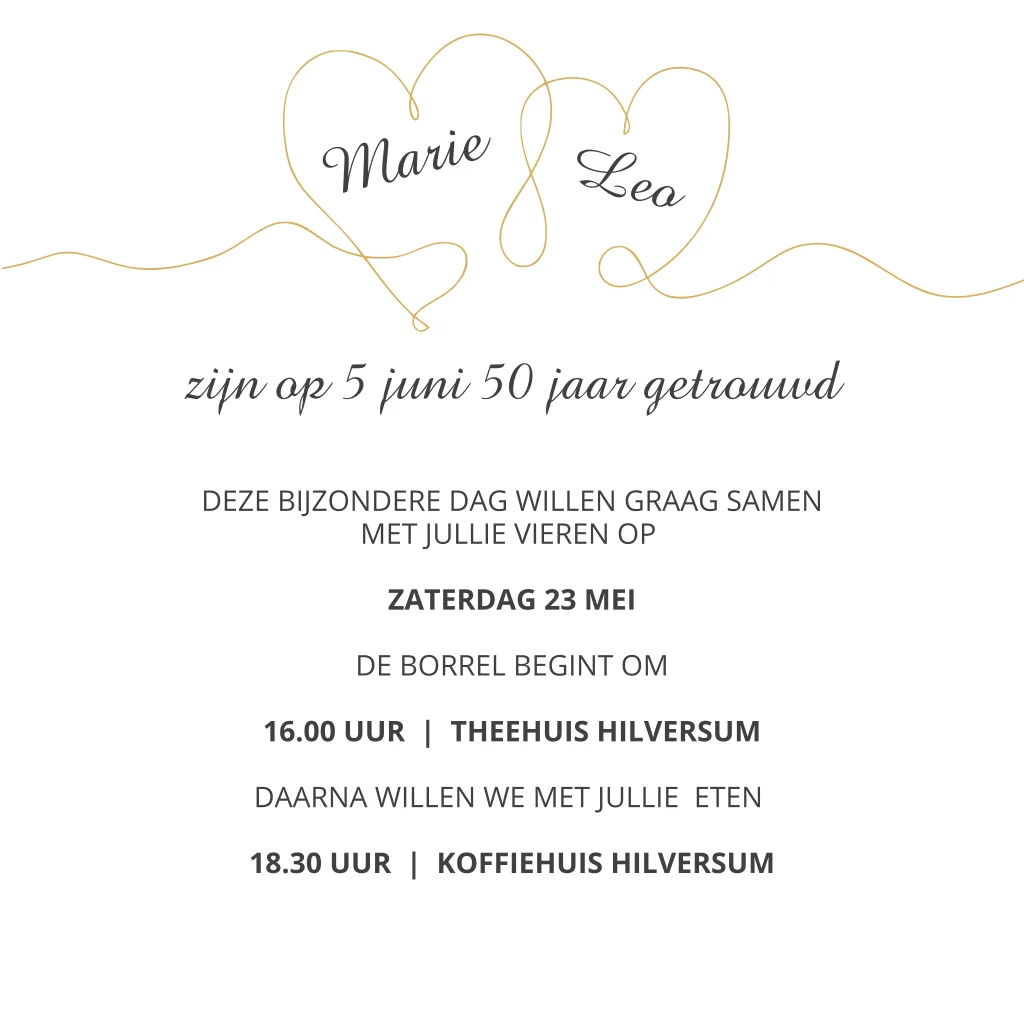 Uitnodiging 50 jaar getrouwd goudfolie met 2 harten in goudfolie