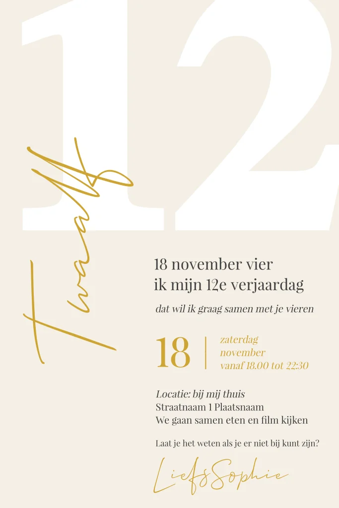 Chique uitnodiging feestje met mooie typografie van de leeftijd (uiteraard naar wens aan te passen). Kleuren kunnen naar wens aangepast worden. (24189)