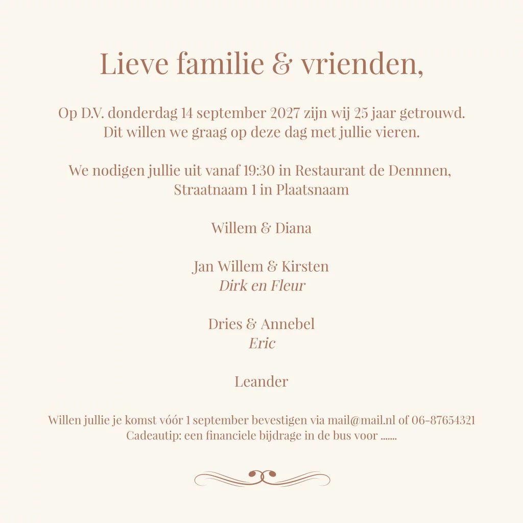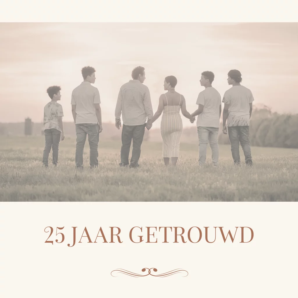 Uitnodiging voor een Jubileum Feest 25 jaar getrouwd met een familiefoto portretfoto. De kaart heeft een klassieke touch met een licht beige / gelige achtergrond. Deze kleur kan helemaal naar wens worden aangepast en uiteraard kun je een eigen foto van de familie plaatsen (24310)