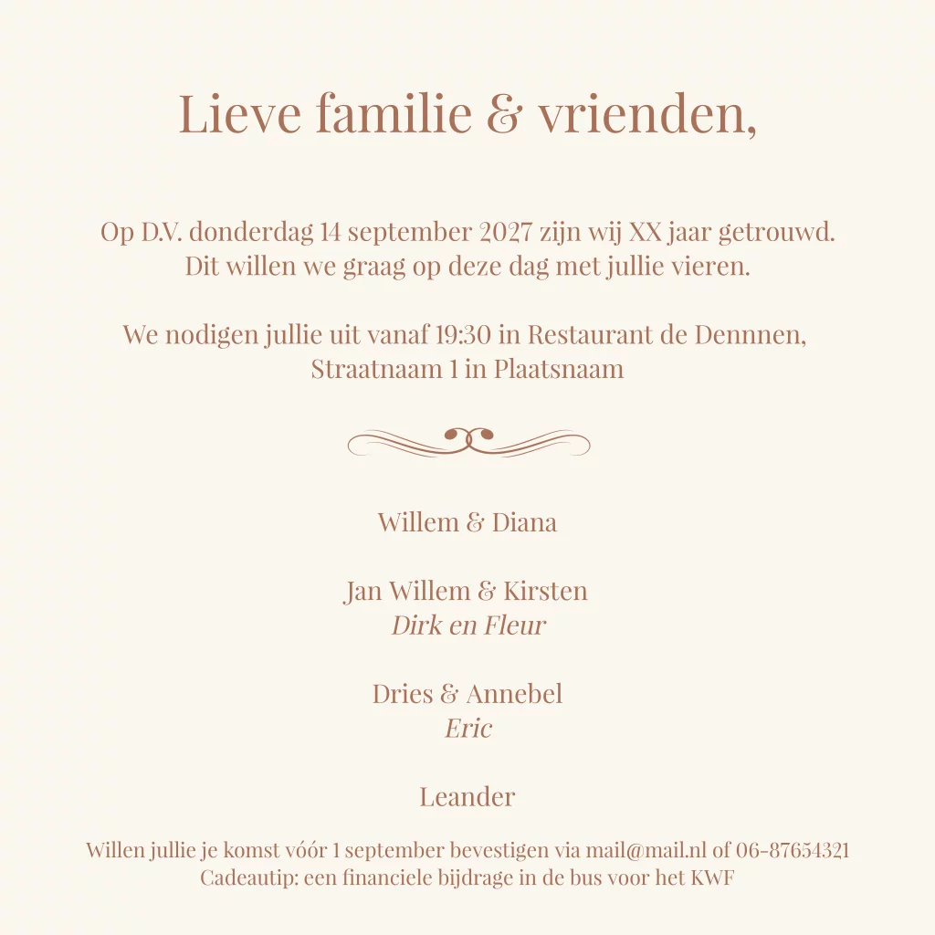 uitnodiging jubileum 50 jaar getrouwd met een familiefoto. De kaart heeft een klassieke touch met een licht beige / gelige achtergrond. Deze kleur kan helemaal naar wens worden aangepast. (24310)